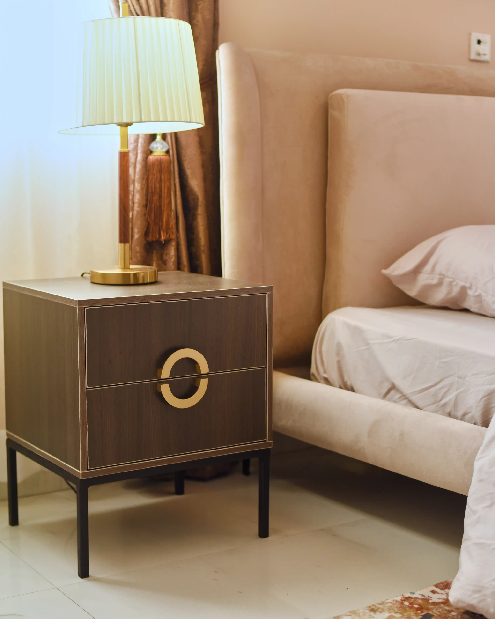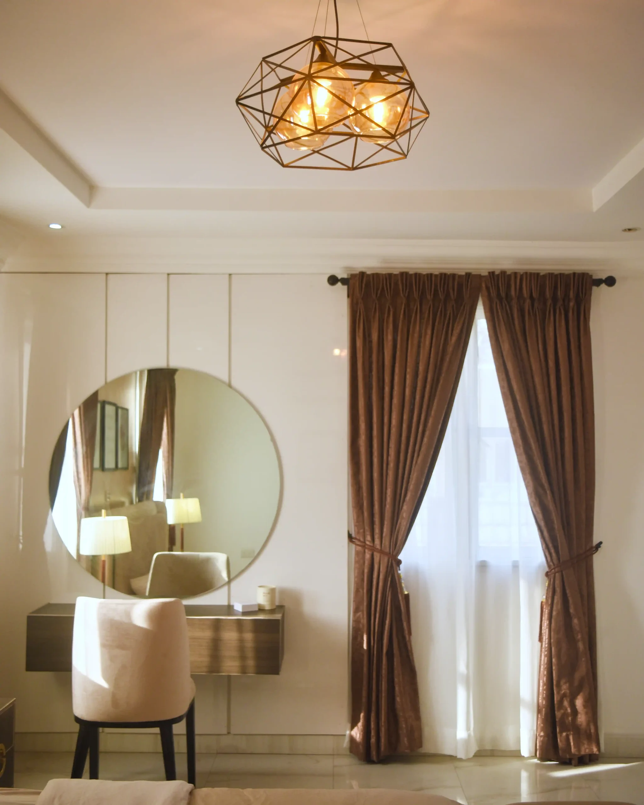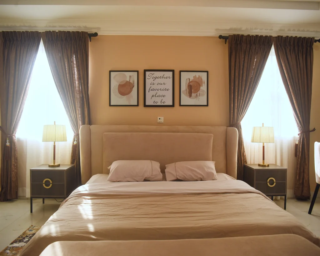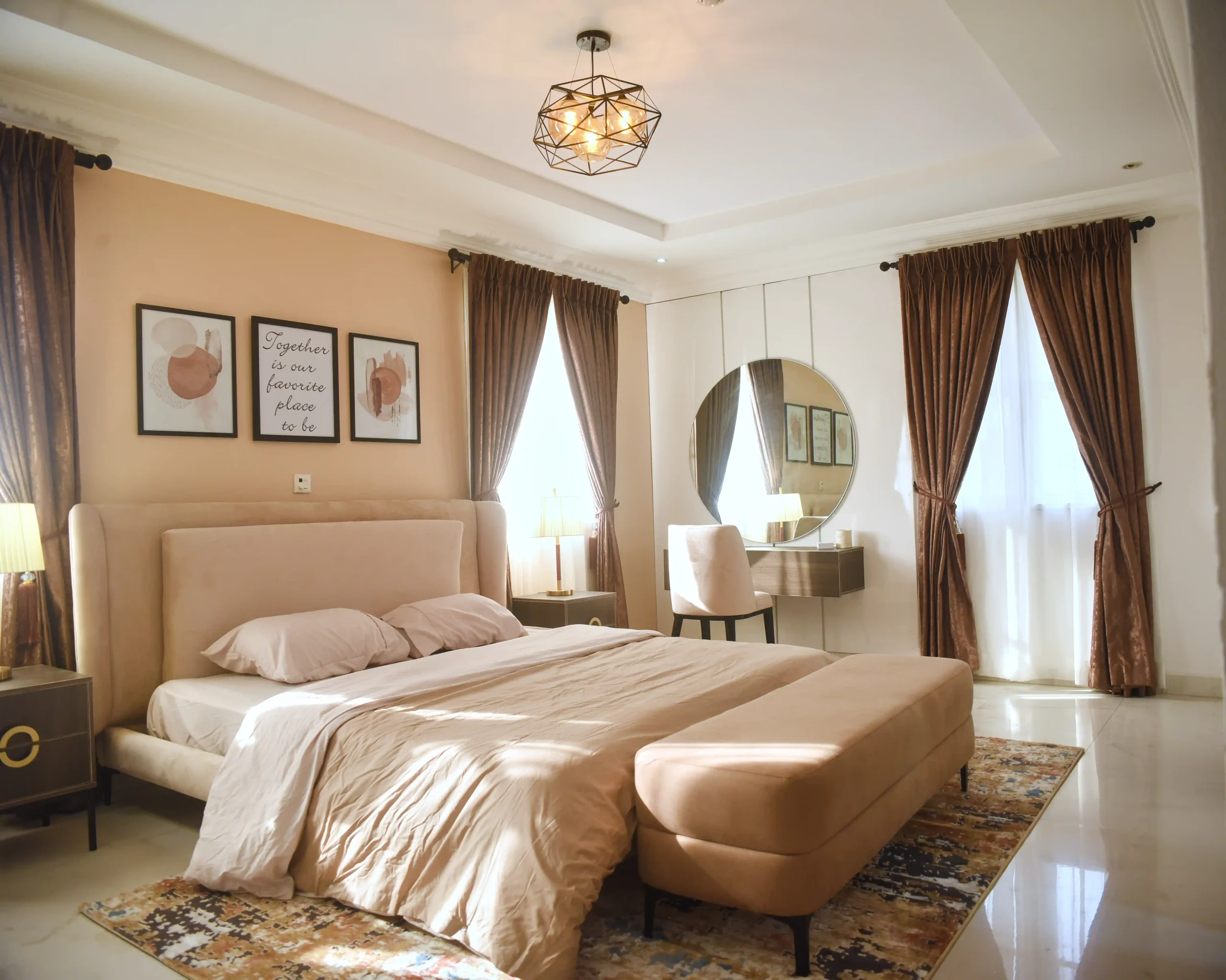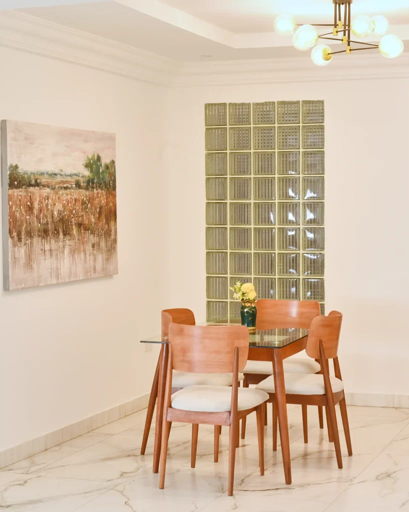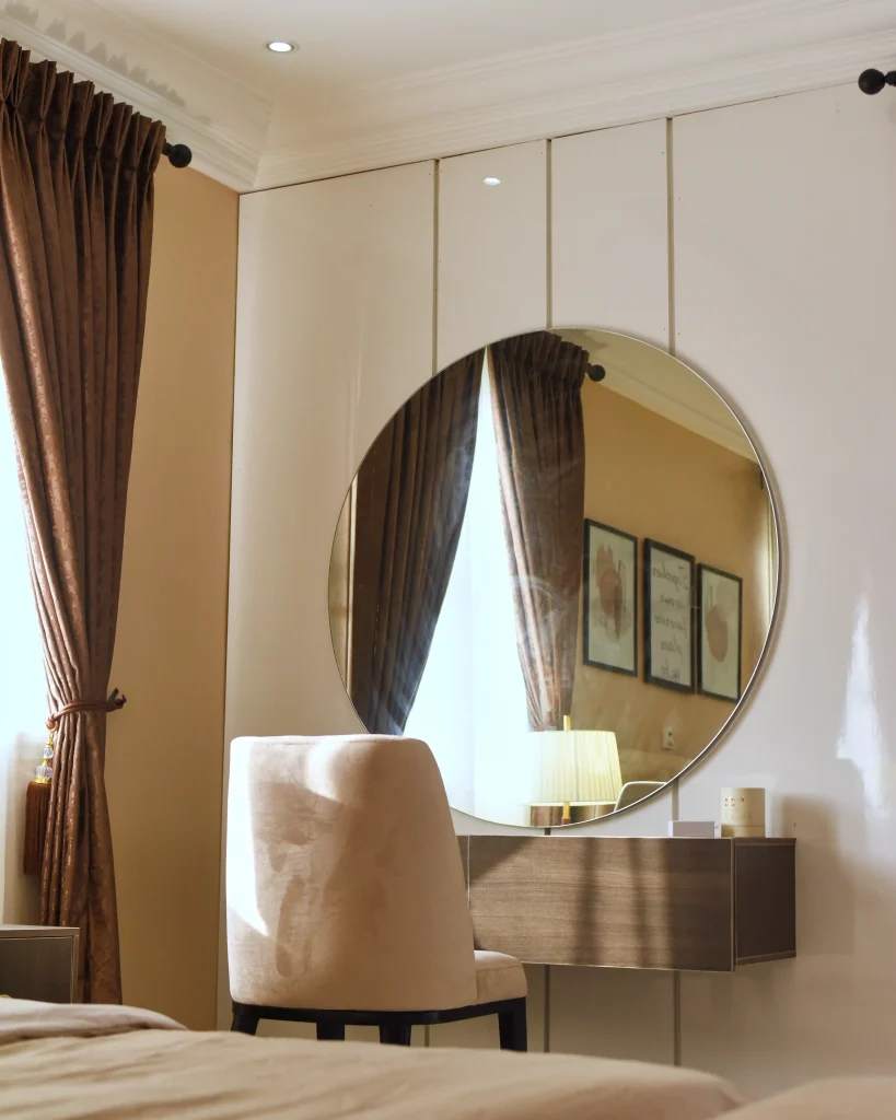 The dining area flows naturally from the living space, offering an inviting setting for everyday meals and intimate gatherings. In the bedroom, the design shifts toward calm and privacy, creating a personal retreat defined by soft textures, layered lighting, and a soothing color scheme of apricot and chocolate brown. Together, the spaces form a cohesive home and maintains a timeless appeal.
