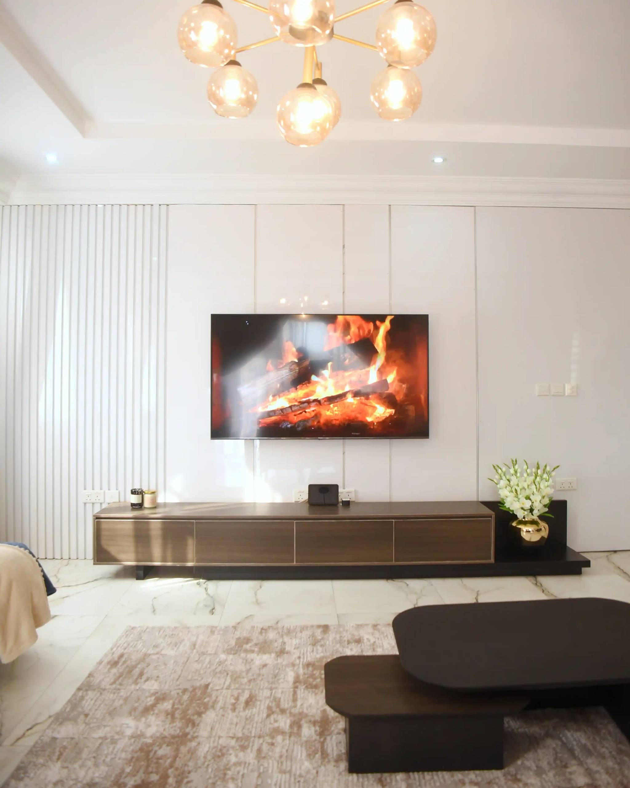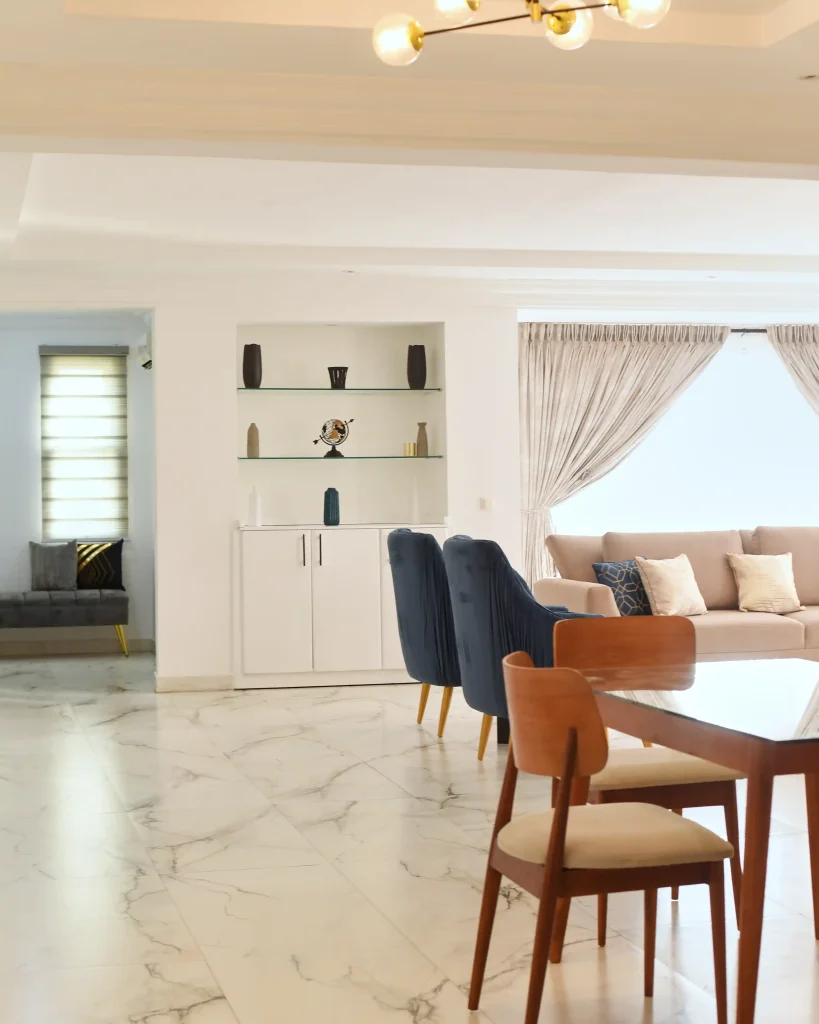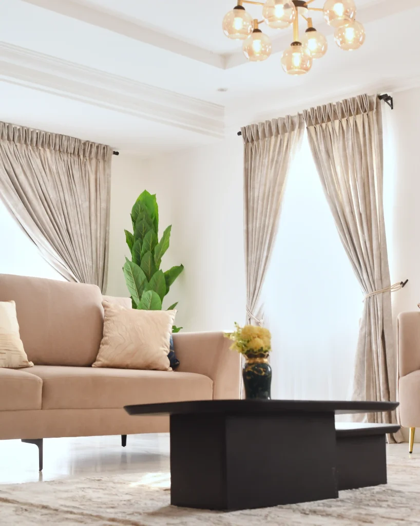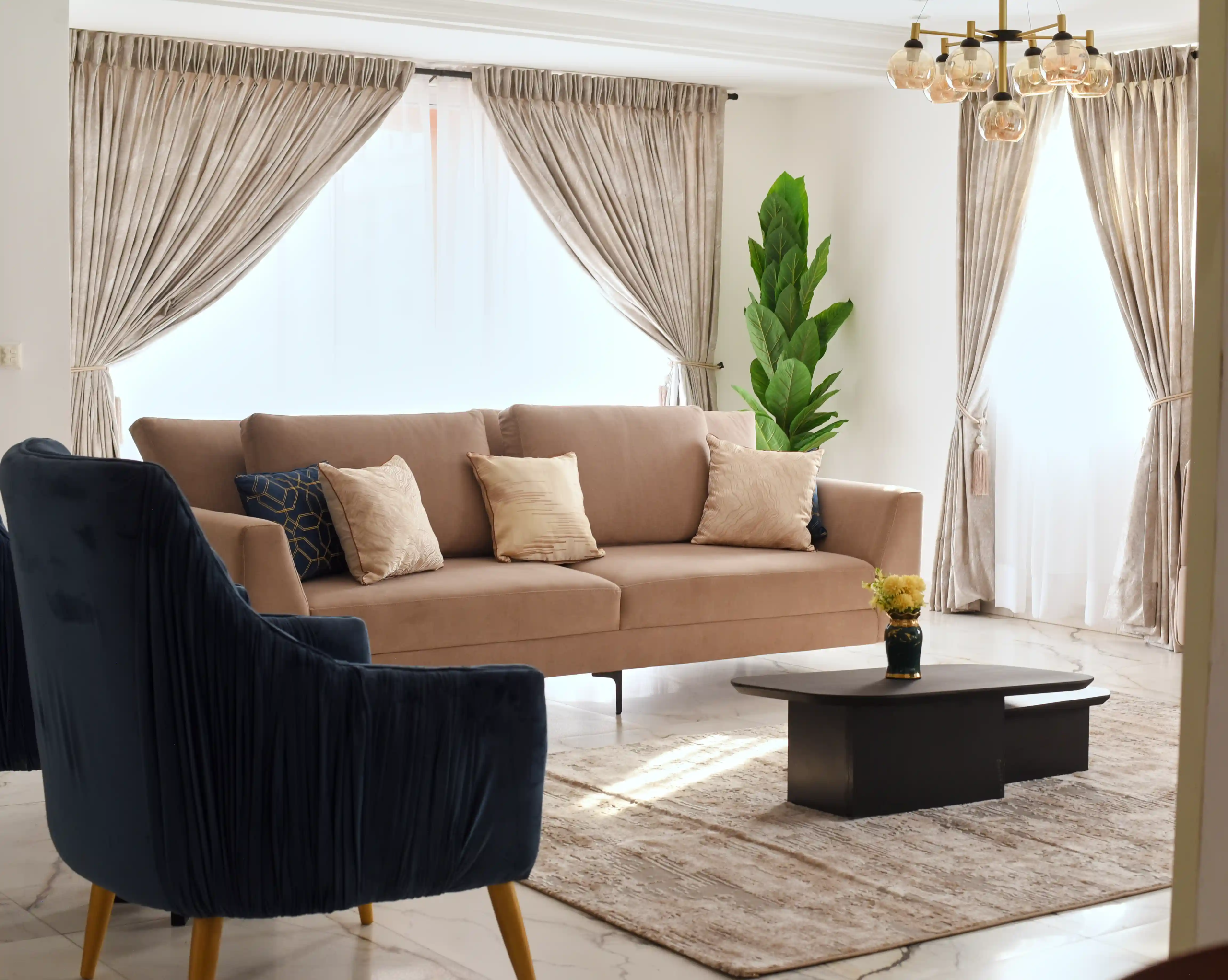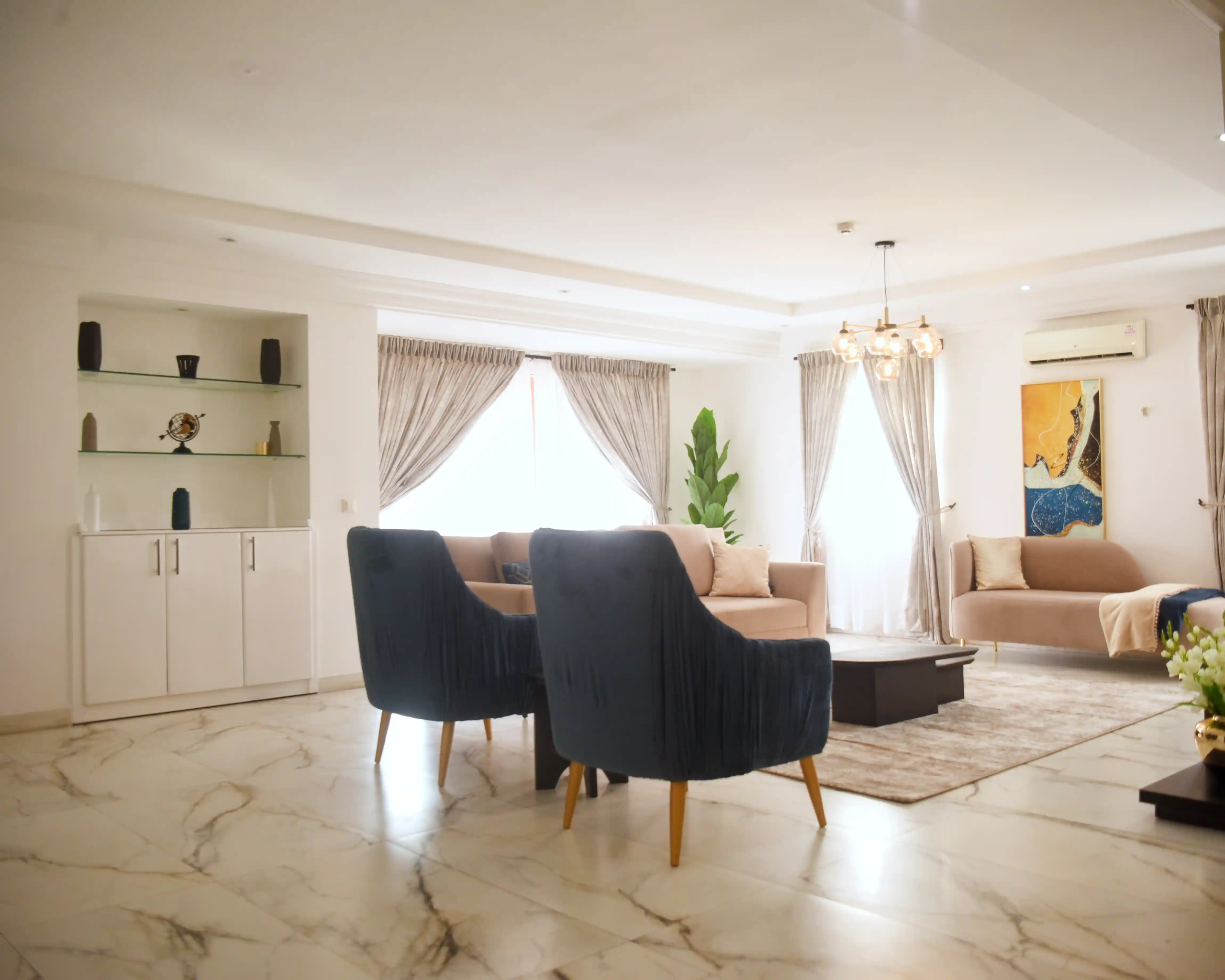 This completed residential project was designed as a seamless blend of comfort, functionality, and aesthetics. The living room serves as the heart of the home—anchored by a balanced palette of nude and blue tones